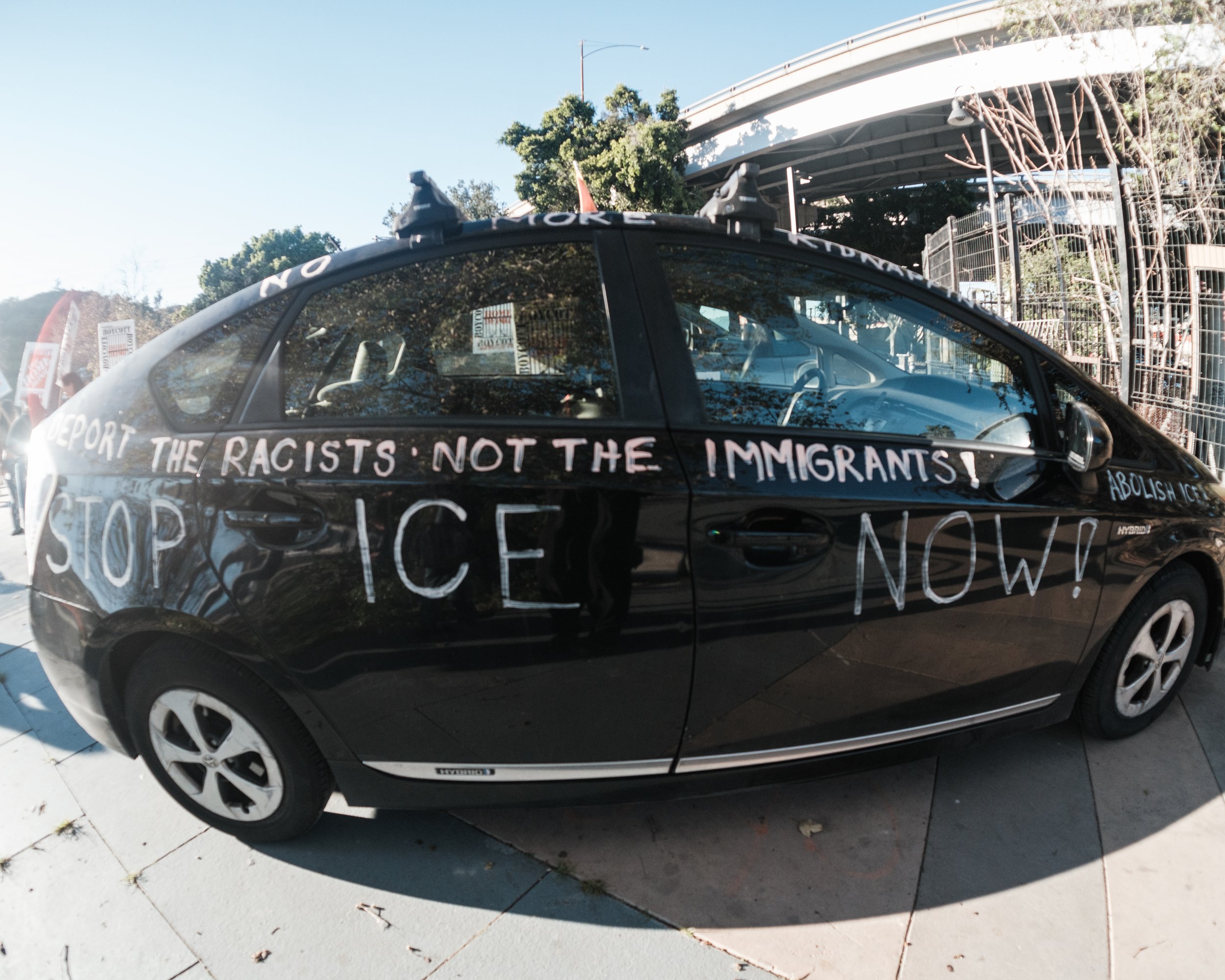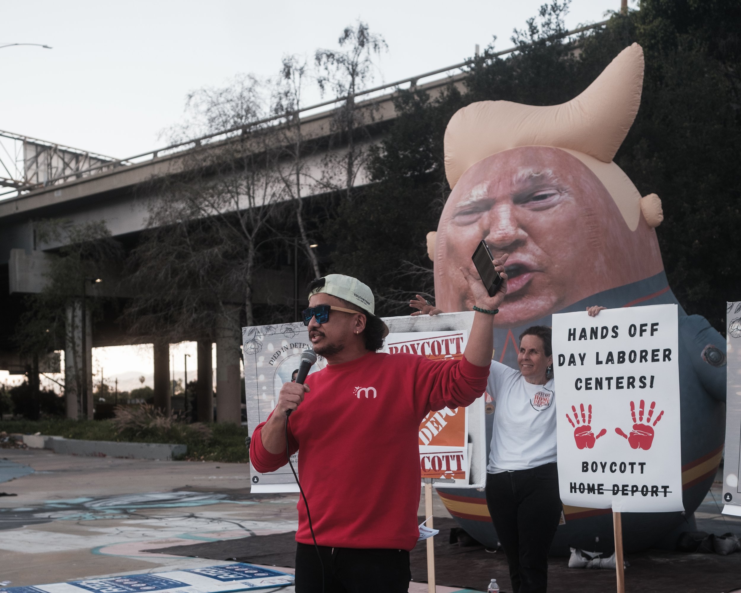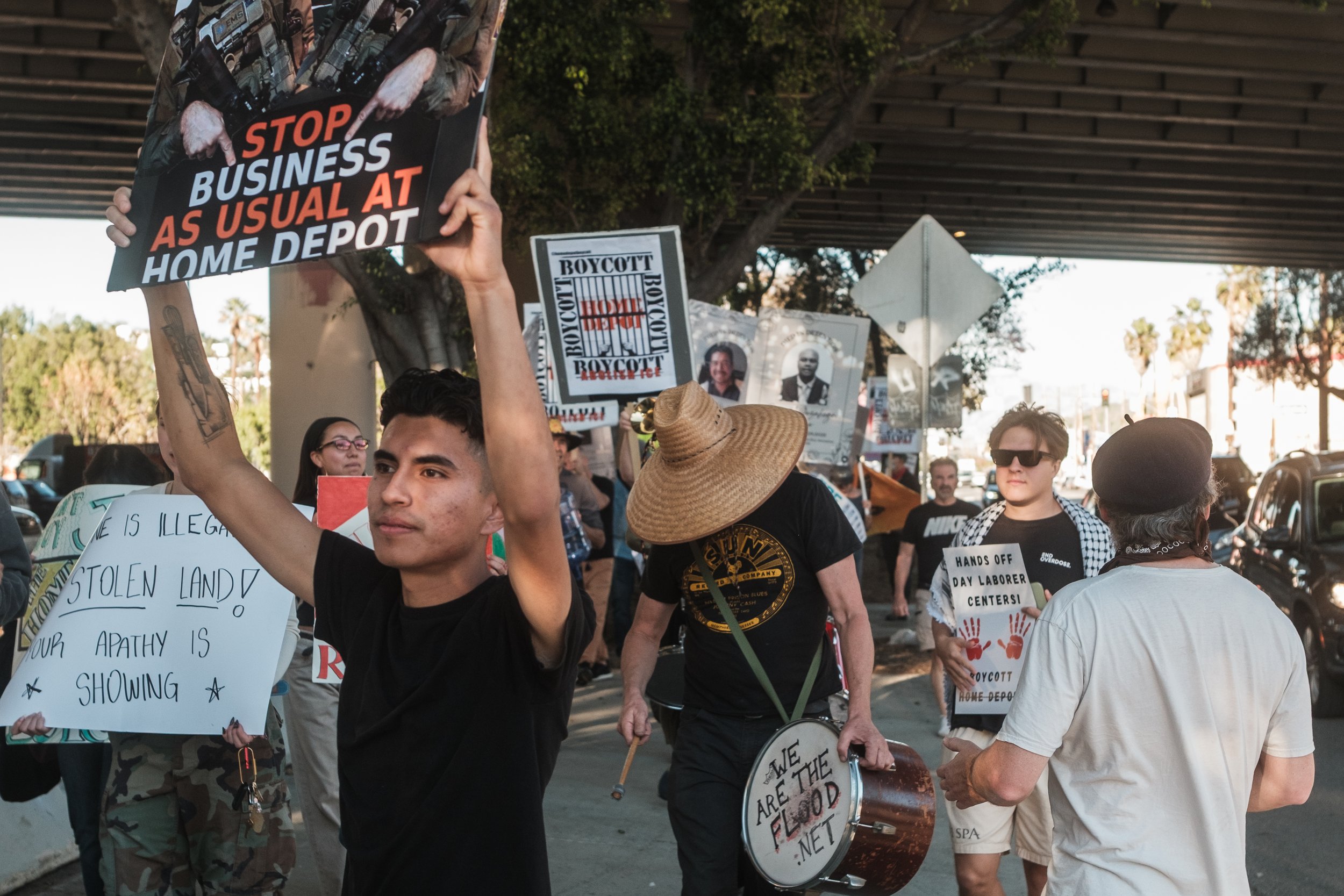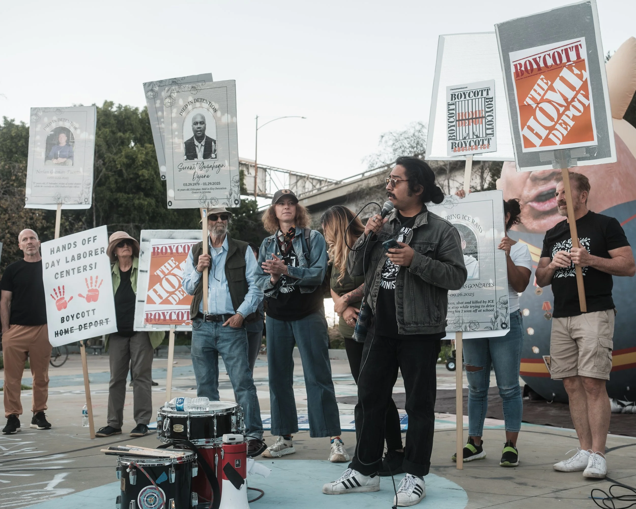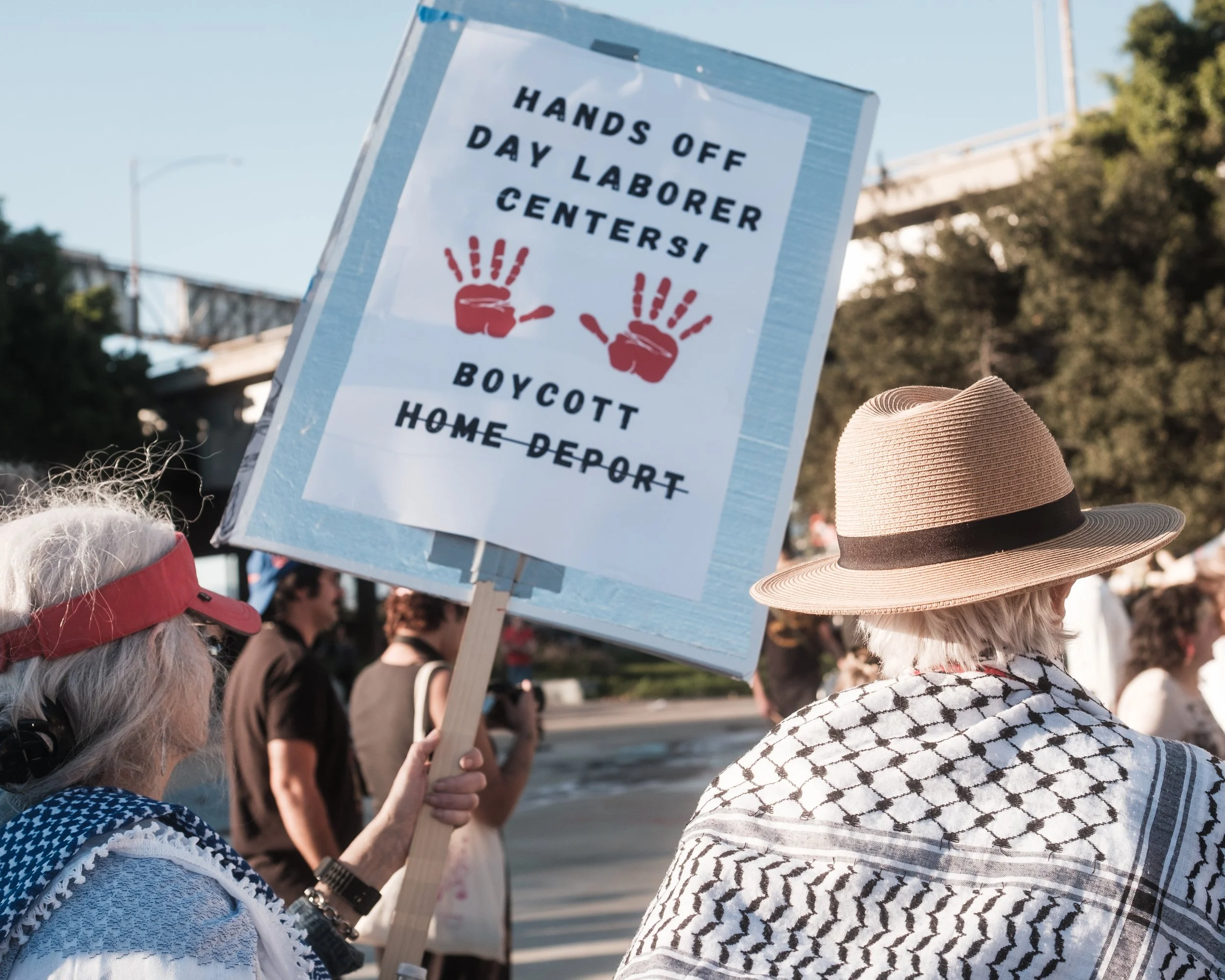 On February 22nd, community members showed up at three Home Depots simultaneously across Los Angeles County: Cypress Park, Westlake, and Torrance. The coordinated action was organized by the Boycott Home Depot Coalition, the Community Self Defense Coalition, and the Northeast Los Angeles Alliance for Democracy. Signs, banners, musical instruments, and a car caravan moving through each parking lot with an audio recording documenting the names and numbers of those taken.