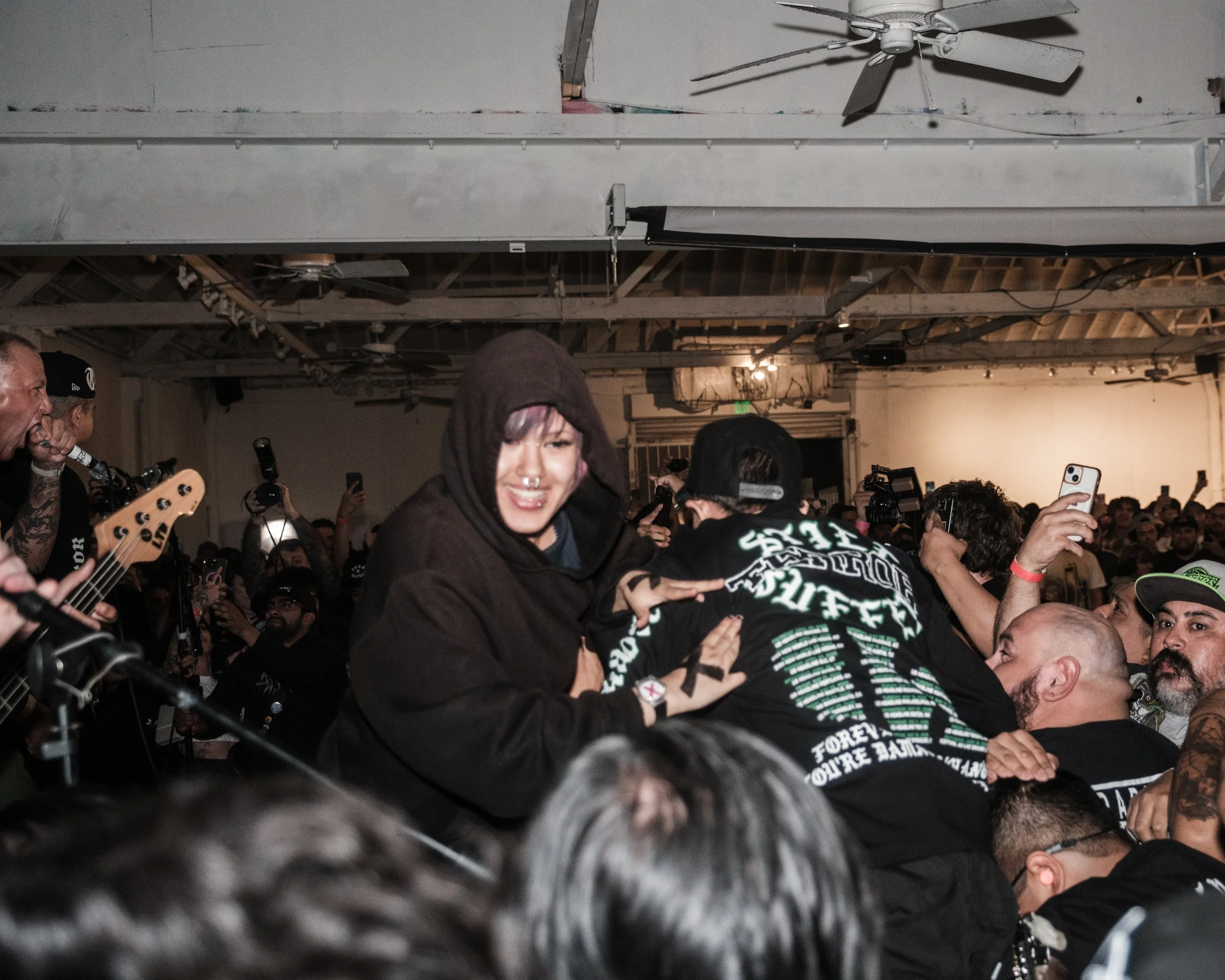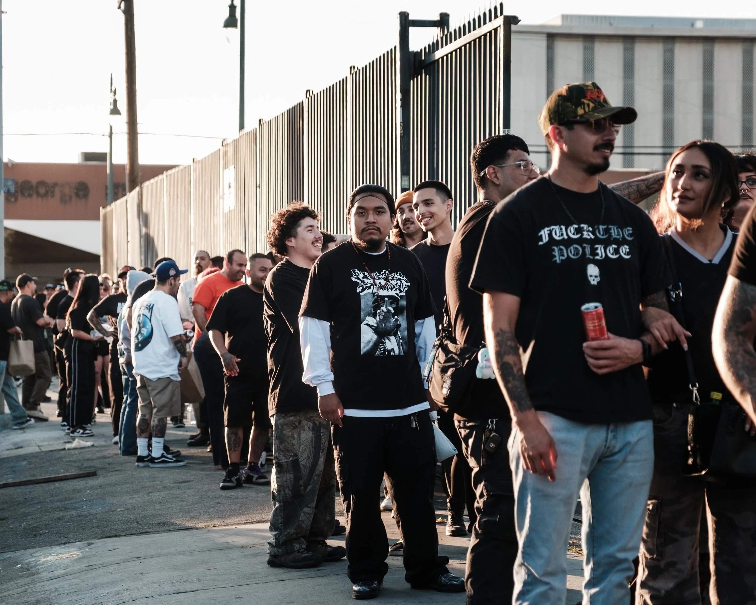 Terror brought Los Angeles Hardcore to Superchief Gallery in Downtown LA on a Tuesday night for a free capsule release party with Born x Raised, the Venice-born streetwear brand that has been a love letter to this city since 2013. Free entry, a line around the corner by 5:30pm, and a room packed well past capacity by the time Terror took the stage. The collaboration made complete sense. Two institutions built on LA pride and uncompromising identity, finding each other in a warehouse in DTLA.
