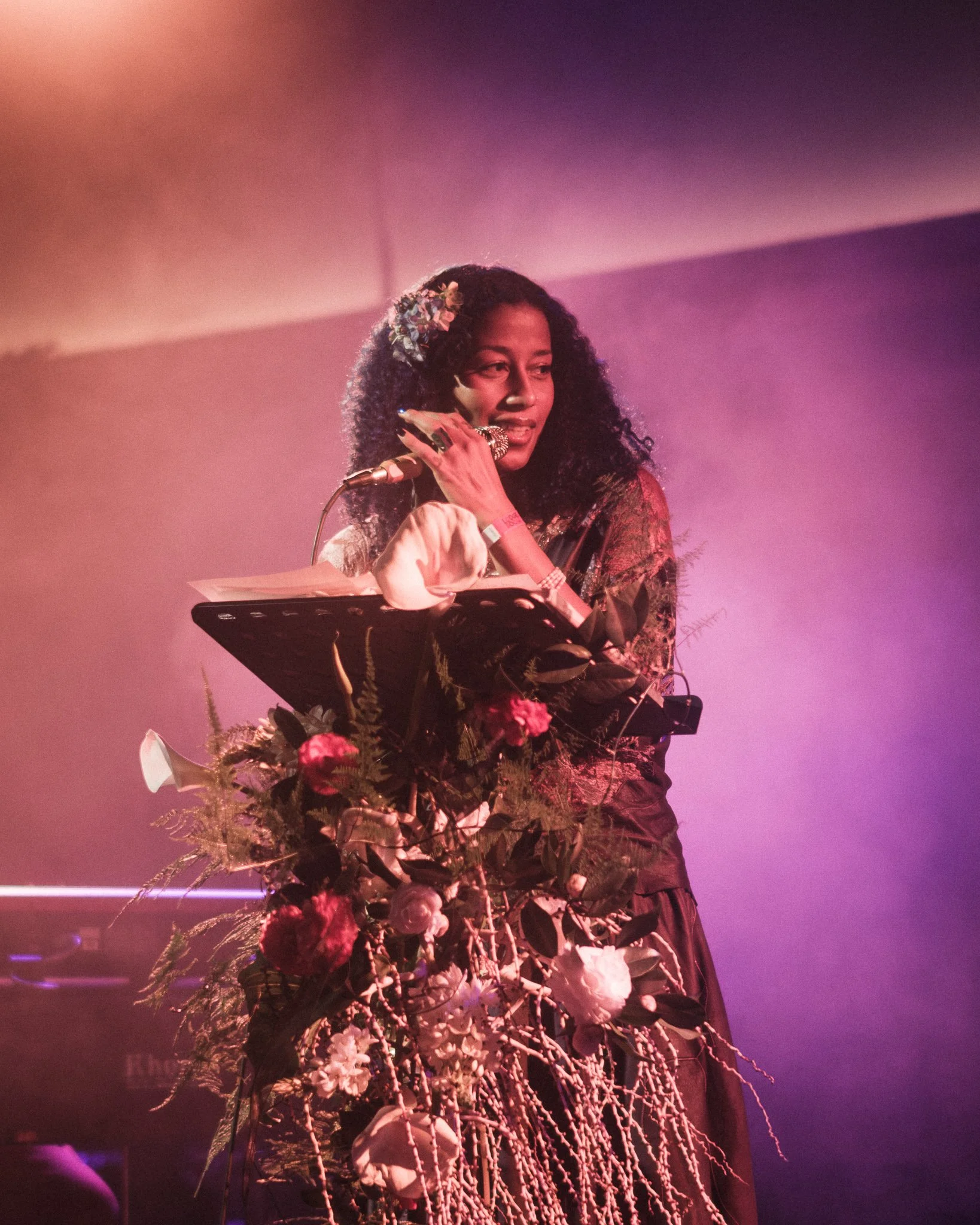 Grammy-nominated poet Aja Monet headlined with a four-piece: Brian Hargrove moving between Nord and Fender Rhodes, Ben Williams on upright bass, and Kweku Sumbry on drums. Monet stood with stacks of notebooks, flipping between poems, some brand new. For her closing piece, she asked the audience to choose between two poems. One was more upbeat, about solidarity between Africa and Palestine. The crowd erupted before she could name the second option. Monet gave prompts to her musicians. To Hargrove: "Play the sound of the first time a baby enters the world." To Kweku: "Play the sound of an angry auntie, upset with her hand on her hip." Then: "Play the sound of an African train heading to the Middle East." The band followed, improvising from her words.