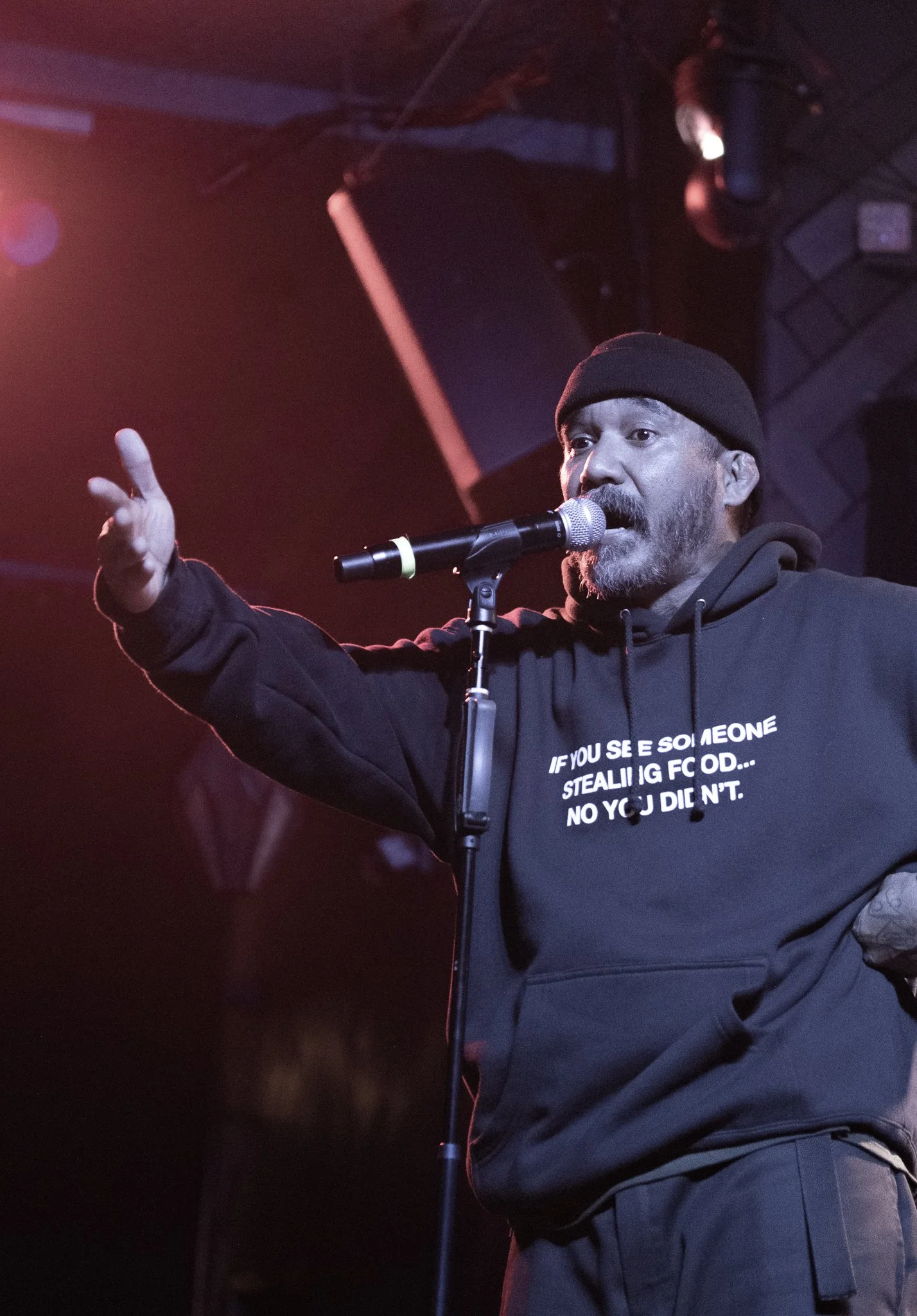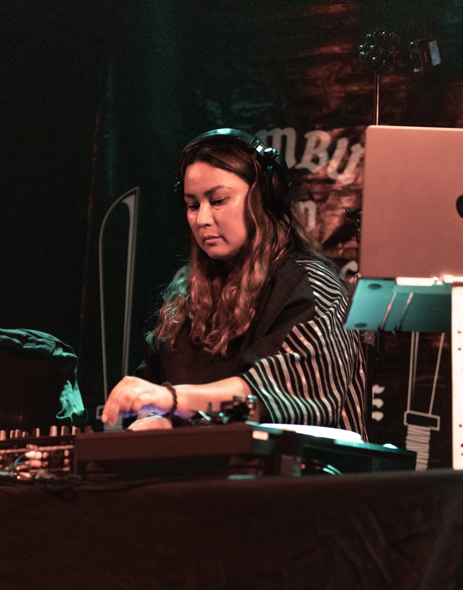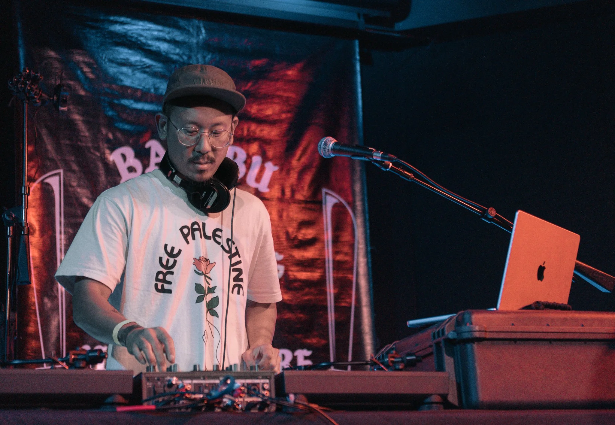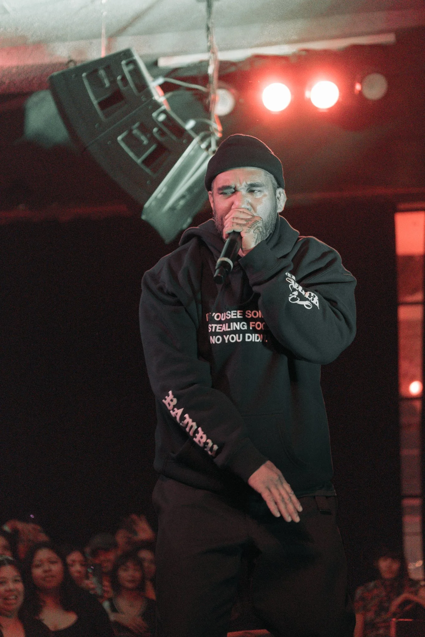 Keffiyehs in the crowd. DJ WenLuv opened with a set that had the room bumping early, then DJ Phattrick took over the 1s and 2s for Klassy. Halfway through Bambu's set, Faith Santilla stepped up. She spoke about the Community Self-Defense Coalition, the work being done to resist ICE, blessed us with sharp prose, gave a lesson in anti-imperialist solidarity that drew the line from Palestine to East LA. When Bambu came back out, the energy was different: sharper, heavier, the crowd locked in.